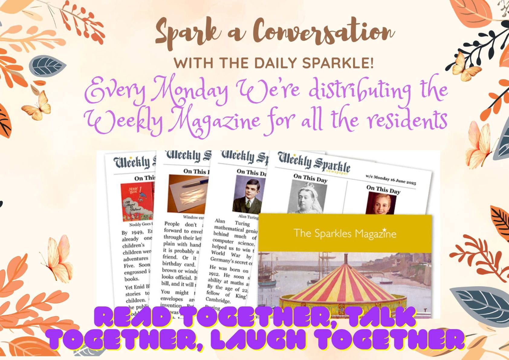 Uses the aid of the weekly Sparkle, the Park Lodge reminiscence paper. We have stimulated some of the dementia residents to recall the things they have done in the past or remember people, places and events that are the featured topics on the paper.